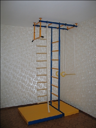 - спортивный комплекс представляет собой сборно-разборную конструкцию из металлических труб, закрепленных между потолком и полом в распор, на котором могут быть установлены до 8 спортивных снарядов.